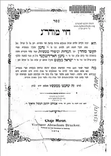 Chayey Moharan Hebrew: חיי מוהר"ן) is the biography of Rabbi Nachman of Breslov, written by his disciple and scribe Rabbi Nathan of Breslov. As the tzaddik is of central importance in Judaism and especially Breslov, and as the book is about Rabbi Nachman's life and Rabbi Nachman and his followers held himself to be the tzaddik hador (tzaddik of the era), Chayey Moharan is an extremely important Jewish book. It became more widely known to Anglophones with the publication of its translation, titled Tzaddik, by Breslov Research Institute, in 1987. MOHaRaN is acrostic for Moreinu V'Rabeinu Harav Rabbi Nachman meaning "Our Master and Teacher, Rabbi Nachman."