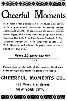 Cheerful Moments was an American monthly mail-order magazine from 1892 until 1908, primarily a vehicle for advertising and light stories of the day, and one of a number of similar publications.