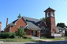 The Methodist congregation in Chelsea was established in 1853, and by 1859, a wooden church had been built at the site of the current structure.[23] The wooden church was used until 1899, when it burned. The current church was built in 13 months at a cost of $6000, and dedicated in February 1900. The congregation grew through the next century, and wings were added to the building in 1963 and 1996. The building continues to be used by the church.[23]