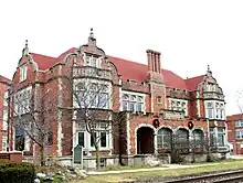 The Welfare Building is a Postmedieval English style building built of brick.[11] It was originally constructed to hold a swimming pool, a billiard hall, a basketball court, a theater and a reading room.