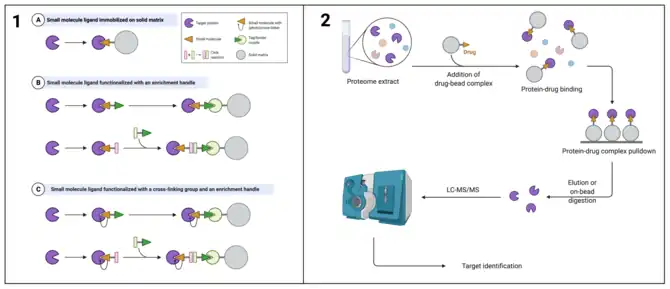 Hybrid solution- and immobilization-based strategies have been applied, in which ligands functionalized with an enrichment tag, such as biotin, are allowed to float freely in solution and find their target proteins. After an incubation period, ligand-protein complexes can be reacted with streptavidin-coated beads, which bind the biotin tag and allow for pull-down and identification of interaction partners. This technology can be extended to assist with preparation of samples for ABPP and photoaffinity labeling. While immobilization approaches have been reproducible and successful, it is impossible to avoid the limitation of immobilization-induced steric hindrance, which interferes with induced fit. Another drawback is non-specific adsorption of both proteins and small molecules to the bead surface, which has the potential to generate false positives.[10]