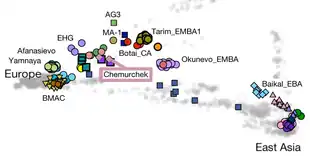 The people of the Chemurchek culture were apparently descendants of Afanasievo populations intermixed with local populations.[1] The Chemurchek culture had various characteristics of West European origin.[4]