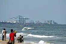 Historically, the port was responsible for the shoreline changes in the region, where the area south of the port has accreted significantly, resulting in the formation of the Marina Beach, whereas the coast in the northern region has undergone severe erosion.[42][43] Ever since the harbour was constructed, the coast north of the harbour has been experiencing erosion at the rate of about 8 m annually. The shoreline has recessed by about 1,000 m with respect to the original shoreline in 1876. It is estimated that 500 m of beach has been lost between 1876 and 1975 and another 200 m between 1978 and 1995. About 350 ha land in the coast north of the port is lost into sea.[37] On the other hand, the area south of the port is increasing 40 sq m every year due to the progradation.[43]