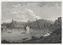 Chepstow was given its first charter in 1524, by Charles Somerset, 1st Earl of Worcester, and became part of Monmouthshire when the county was formed. The town appears as "Strigulia", "Chepstowe" and "Castelh Gwent" on the Cambriae Typus map of 1573.[11] The castle and town changed hands several times during the English Civil War, and the regicide Henry Marten was later imprisoned and died in the castle. The port continued to flourish; during the period 1790 to 1795, records show a greater tonnage of goods handled than Swansea, Cardiff and Newport combined. Chepstow reached the peak of its importance during the Napoleonic Wars, when its exports of timber, for ships, and bark, for leather tanning, were especially vital. There were also exports of wire and paper, made in the many mills on the tributaries of the Wye.[6] An important aspect of Chepstow's trade was entrepôt trade: bringing larger cargoes into the manageable deep water of the Wye on high tide and breaking down the load for on-shipment in the many trows up the Wye to Hereford past the coin stamping mill at Redbrook, or up the Severn to Gloucester and beyond. Chepstow also traded across the estuary to Bristol on suitable tides to work vessels up and down the Avon to that city's centre. Many buildings in the town remain from the late 18th and early 19th centuries; the elegant cast iron bridge across the Wye was opened in 1816 to replace an earlier wooden structure.[6]