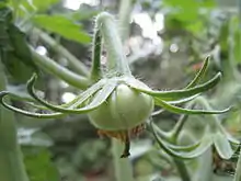 A Cherokee Purple tomato in the first stages of development.