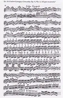 Little is known about Saint-Georges' early musical training; he was sent to Paris to begin his musical studies at age 7. Given his prodigious technique as an adult, Saint-Georges must have practiced the violin seriously as a child.[31] Banat, since 1970 violinist in the New York Philharmonic under Pierre Boulez, discounted François-Joseph Fétis's claim that Saint-Georges studied violin with Jean-Marie Leclair.[15] Some of his technique was said to reveal influence by Pierre Gaviniès. In 1764, when violinist Antonio Lolli arrived in Paris, he composed two concertos, Op. 2, for him.[lower-alpha 3] In 1766, François-Joseph Gossec dedicated a set of six string trios, Op. 9, to Saint Georges.[33] Lolli may have worked with Bologne on his violin technique and Gossec on compositions. In 1769, the Parisian public was amazed to see Saint-Georges, the great fencer, playing as a violinist in Gossec's new orchestra, Le Concert des Amateurs in Hôtel de Soubise.[34]