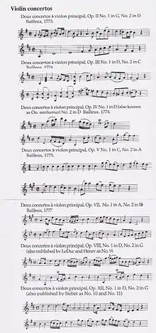 Saint-Georges's first composition Op. I, probably composed in 1770 or 1771, was a set of six string quartets, among the first in France, published by famed French publisher, composer, and teacher Antoine Bailleux.[36] He was inspired by Haydn's earliest quartets, brought from Vienna by Baron Bagge. Also in 1770, Carl Stamitz dedicated his own set of six string quartets to Saint-Georges.[37] By 1771, Gossec had appointed Saint-Georges as the concert master of the Concert des Amateurs.[38]