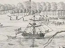 The chialoup sail plan mimics that used in sloops, with a combination of square-rigged and fore-and-aft sails. The boats are usually single-decked with one mast, sometimes with an added mizzen mast.[1]: 34 While most such chialoups use a European-style central rudder, some are equipped with two side (quarter) rudders, a characteristic of Nusantaran boats. The length is between 15 and 25 meters, with a cargo bay almost 6 meters long. Depending on the size of the boat, crews run 20 to 40 people, with a typical load capacity of 72 to 144 metric tons.[2] In the syahbandar's (harbourmaster) record of Malacca a chialoup is listed carrying up to 200 tons of cargo and a crew of 75 people.[3] Chialoups on average were armed with 4 cannons, 1 swivel gun, and 7 snaphaunces.[4]