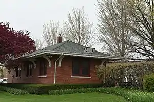 The Chicago, Rock Island and Pacific Passenger Depot-Pella, also known as the Pella Depot and the Rolscreen Museum, is a historic building located in Pella, Iowa, United States. The Des Moines Valley Railroad built the first tracks through the area in 1865, and they built a simple frame depot to serve passenger's needs. For 10 years, Pella served as the only rail stop in Marion County until a competing station was built in Knoxville, Iowa by the Chicago, Burlington, and Quincy Railroad.[2] The Chicago, Rock Island & Pacific Railroad leased the Des Moines Valley's tracks beginning in 1878 and provided freight service through 1980. The old frame building was replaced, in 1906, with a single story, brick depot–a conventional building style for the railroad. The new, brick depot served as a passenger station until the latter 1940s. The last passenger service was as a stop on a short line motor train service between Eldon in southeast Iowa and Des Moines.[3] The station was freight only by 1949.[4]