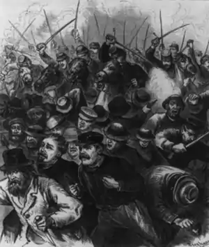 ![]() Violence in Chicago as depicted on the August 11, 1877 cover of Frank Leslie’s Illustrated Newspaper | |