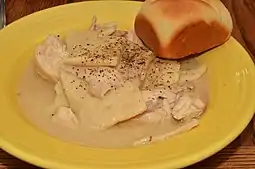 A variant known as "chicken and pastry" or simply "chicken pastry" features wide, flat noodles rolled from biscuit dough. Where such a distinction is made, it is sometimes considered a different dish from "chicken and dumplings", which is known for small balls of dough rather than flat strips. In the Appalachian region of the United States, this preparation is called chicken and slicks.[9] The Pennsylvania Dutch version is called bott boi.[10] Chicken and dumpling soup is another variation, and is very popular in the Midwest.[11]