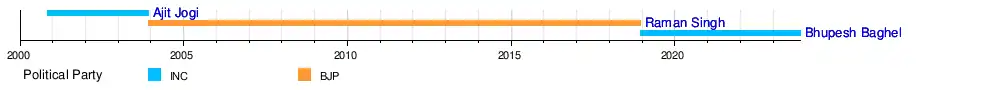 Three people have served as the state's chief minister since Chhattisgarh's formation on 1 November 2000 as a result of the Madhya Pradesh Reorganisation Act, 2000.[3] The first was Ajit Jogi of the Indian National Congress. He was succeeded in 2003 by Raman Singh of the Bharatiya Janata Party who served three consecutive five-year terms. His successor, and current incumbent, is the Indian National Congress leader Bhupesh Baghel who was elected in 2018.