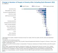 A large proportion of children in the United States experience poverty. As of 1992, children were the largest age group living below the poverty line,[1] and around 1 in 5 children were affected as of 2016.[2] Child poverty is measured using absolute and relative methods. It is caused by many factors, including race, education, and family structure, but ultimately race correlates with these factors. There are multiple effects due to this. Effects on health and development cause lifelong problems and lower educational outcomes, and food insecurity can also be caused by child poverty. The United States government has put in place programs using tax credits and transfers. There are also community programs that have impacted specific communities that have high child poverty rates. For future policies, research suggests that greater investment directed to children and families in poverty and connections between healthcare providers and financial services can lower the child poverty rate. In 2022, the child poverty rate climbed to 12.4% from 5.2% in 2021, largely as a result of the end of pandemic aid in late 2021.[3][4]