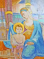 The murals were designed by Ethel Anderson and painted as a collaborative project by the Turramurra Wall Painters Union—a group of modernist painters founded by Anderson in 1927—among whom were Ethel Anderson, Bethia Anderson, sisters Gwen and Jean Ramsey, Roy de Maistre and Roland Wakelin.[1] Friends of the artists also helped on small parts of the painting. Some parts of the mural are attributable to individual artists and some are signed. The rector of St James' at the time, Philip Micklem, was a friend of Anderson and had invited the Turramurra Wall Painters Union to decorate the chapel.[2] The work was carried out between October and December 1929[3] and completed in time for Christmas; the first service being held on 22 December 1929.