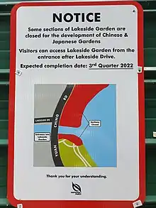 Chinese Garden (traditional Chinese: 裕華園; simplified Chinese: 裕华园; Malay: Taman Cina; Tamil: சீனத்தோட்டம்) is a park in Jurong East, Singapore. Built in 1975 by the JTC Corporation and designed by Prof. Yuen-chen Yu, an architect from Taiwan, the Chinese Garden's concept is based on Chinese gardening art. The main characteristic is the integration of architectural features with the natural environment. The Chinese Garden is modeled along the northern Chinese imperial style of architecture and landscaping.[1] It is located next to Chinese Garden MRT station and connected to the adjacent Japanese Garden by a bridge. Along with Japanese Garden, the two gardens are collectively known as the Jurong Gardens.
