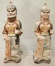 During the Northern and Southern dynasties period (420–589), a style of armour called "cord and plaque" became popular, as did shields and long swords. "Cord and plaque" armour consisted of double breast plates in the front and back held together, sometimes on a frame, by two shoulder straps and waist cords, worn over the usual lamellar armour. "Cord and plaque" wearing figurines are also often depicted holding an oval or rectangular shield and a long sword.[37] Types of armour had also apparently become distinct enough for there to be separate categories for light and heavy armour.[38]