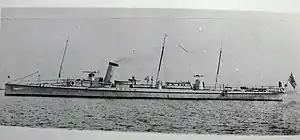 Her main armament was three 14-inch (360 mm) torpedo tubes. Two of them were located in torpedo rooms on both sides of the bows. The third one was on the truck which was located on the stern.[2] There were Schwartzkopff torpedoes in store.[4] Sources conflict as to whether a third tube was present, but reports of three torpedoes being fired in rapid succession at the Battle of Weihaiwei indicates that a third tube was present.[3] There was a secondary armament of two 37 millimetres (1.5 in) guns.[2] Fulong had a complement of 20 officers and men. She had a coal-fired reciprocating engine, with a single boiler and shaft. This produced 1,597 indicated horsepower (1,191 kW), which enabled the vessel to reach a speed of 24.2 knots (44.8 km/h; 27.8 mph).[4]