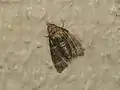 Adult wingspan is 1.5 cm. Forewings shining gray, whereas hindwings light gray. Submarginal band of forewing is broken. Reniform open anteriorly. Dark grayish subbasal shading visible. Valves of male genitalia slender and curved upwards. Short uncus is broad and polygonal. Caterpillar has dull violaceous dorsum and greenish ventrum. Head brownish, which becomes testaceous in late instars. Spiracles narrow. Legs and prolegs short.[5] Final instar is dark pink.[6]