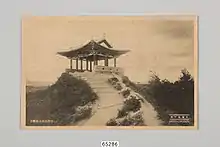 The Choesung Pavilion (Korean: 최승대) is an historic structure located on Moran Hill in Kyongsang-dong, Chung-guyok, Pyongyang, North Korea. First built in the 6th century, it was rebuilt in 1716.[1] One of the National Treasures of North Korea, it is located at the highest point of the hill, 95 meters above ground.[2] The pavilion is bounded on the south and west by rounded, low summits separated by three valleys. It offers views of the many species of trees growing on the hill, including pine, fir, Korean pine, trifoliate pine, linden and poplar. One can seasonally also observe over 70 species of birds from the location.[3]
