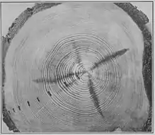 Defoliation of trees reduces their photosynthetic capacity and therefore curtails growth. In conifers, reduction in radial growth does not normally coincide with the first year of defoliation. For instance, the ring width of white spruce showed reduced growth throughout the stem beginning in the year after defoliation by the European spruce sawfly (Gilpinia hercyniae Htg.).[59] One preliminary study showed that, during the first 3 or 4 years, repeated severe defoliation of white spruce by the spruce budworm was not reflected in reduced radial growth.[60] However, in the Lac Seul infestation in northwestern Ontario, apparent radial growth suppression in white spruce first occurred in the 2nd and 3rd years of severe defoliation.[15]
