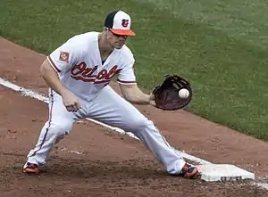 Davis was recalled on August 25 after Andruw Jones went on the DL and Blalock struggled.[28] On September 8, in the second game of a doubleheader, he had three hits and four RBI, including a three-run home run against José Veras in a 10–5 victory over the Cleveland Indians.[29] When Davis returned to the majors, his numbers improved dramatically, as he hit .318 in September and October, with five home runs and 21 RBIs in the two-month span.[30] In 113 games (391 at bats), Davis batted .238 with 93 hits, 15 doubles, 21 home runs, and 59 RBI. However, he ranked seventh in the AL with 150 strikeouts.[5] He did do well defensively; Washington said, when Blalock replaced him at first following his demotion, "We can't expect Hank Blalock to be Chris Davis [defensively], but Hank is a professional. I think he can play first base."[26]