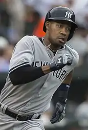 The New York Yankees signed Young to a minor league contract on August 27, 2014.[24] He was called up on September 2, 2014, when rosters expanded. Nine days later, on September 11, Young broke up a no-hitter in the 8th inning with a double and then hit a walk-off, three-run home run to seal the Yankees' 5–4 win over the Tampa Bay Rays. The next day, Young hit his third home run in three days, breaking a scoreless tie in the 11th inning, and (temporarily) pushing the Yankees into the lead against the Baltimore Orioles. Also on September 12, in the second game of the Orioles doubleheader, Young also made two dramatic defensive plays, twice sliding to catch fly balls in left field. In 23 games for the Yankees, Young batted .282 with three home runs.[25]