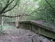 Five through tracks serving seven platform faces were built just beyond the junction near Stammerham Farm, 2.25 miles (3.62 kilometres) south of Horsham and 40 miles 7 chains (64.5 kilometres) from London Bridge, where the Cranleigh Line diverged northwards from the Mid-Sussex Railway.[14][17][18][19][20][12][21] Two tracks led to three platform faces which curved away to the west for services on the Cranleigh Line and the Steyning Line; the Down line had platforms on both sides (Platform 5) while the Up track used the outside face of an island platform (Platform 4) which was enclosed by the Up and Down Guildford lines.[16][22][10] The two platforms of the island platform were built at a very sharply curving angle to the rest from which they were separated;[10] they were said to represent a southern equivalent of Ambergate railway station.[23] Two tracks served the Mid-Sussex Line: the Up line used the inner face of the island platform (Platform 3) and the Down was the outer face of a second island platform (Platform 2).[22][21] A bidirectional loop line ran on the inner face of the island platform serving a platform adjacent to the main station building.[22][21][10] This third platform (Platform 1) was used mainly at the beginning and end of school terms for the reception and dispatch of pupils' trunks, as well as for holiday specials.[24][25][26] The station was ready to become an important junction serving most of West Sussex with trains travelling from London via Horsham having the option of routes to Pulborough, Shoreham-by-Sea, Guildford and beyond.[27]