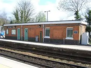 The goods shed, which had been used as a lost property store until around 1950, survived and was rented to Scottish & Newcastle as a distribution depot.[47] Until relatively recently, there was a staffed ticket office in a box on the up platform, adjacent to a surviving semaphore signal.[20][37][60][61]