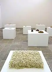 Löhr is best known for her sculptures and installations that are composed of organic elements as construction materials, including horsehair, airborne seeds, plant stalks, tree blossoms, burrs and other elements from nature. The Italian art historian Germano Celant describes her artistic attitude as follows: “Contrary to the heaviness and the physical and environmental gravity of much contemporary sculpture, the aspiration of this German artist is to express a sense of delicacy and evanescence, softness and lightness.”[3] She uses oil stick, ink and graphite as drawing material. ”Surface and space are the major themes of her drawings. Linear structures 'grow' out from a point often from the bottom of the page to the top edge, the artist describes this effect as 'a streaming out, from the inside to the outside'. Optically the structures strive for space far beyond the borders of the paper, it seems they could grow endlessly and take over the room.”[4]