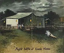 On the night of February 7, Evans and Morrell were sitting in front of the fireplace at Camp Manzanita while Evans read a newspaper aloud. Evans was in his shirtsleeves and had taken off his artificial arm his wife had given him, as his stump still pained him. As Evans paused to laugh with Morrell over something he found funny, the posse came up upon the cabin. As several men in the posse attempted to move to the other side of the cabin to get a crossfire, deputy Timmins stepped on a twig and caused Evans' pet cat to sound the alarm. Evans ran out of the cabin without a coat or hat, and aimed his rifle at the posse when deputy Henry fired, barely grazing Evans' scalp. Evans and Morrell did not return fire but instead ran behind the large granite slab against which the cabin had been built, and disappeared into an arriving blizzard.