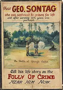 Evans was accused of robbing the Southern Pacific Railroad in California between 1889 and 1892. After killing a member of a posse outside his home on the outskirts of Visalia, he fled to the Sierra Nevada mountains with his younger partner, John Sontag. While Evans and Sontag hid out in the mountains, writers Ambrose Bierce and Joaquin Miller championed their cause in the San Francisco Examiner. The outlaws evaded capture for ten months, all while being hunted by posses of lawmen, railroad detective, and hundreds of bounty hunters. They had a shootout with a posse at Youngs cabin, which resulted in the death of Wilson, the posse leader, and McGinnis, a former friend of Chris Evans. Later, John Sontag was mortally wounded in what is called the Battle of Stone Corral.