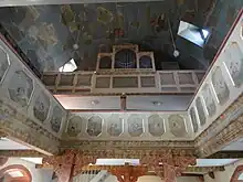 The parish became Lutheran during the Reformation in the 1540s. It separated from Camberg and had its own pastor. In 1644, Walsdorf and its church were devastated by fire, caused by Bavarian soldiers during the Thirty Years' War. The church was rebuilt from 1652 to 1663.[1] A ceiling painting by Veit Graf was completed in 1660, with references to Luther's Small Catechism.[3] An organ was installed in 1697. A crucifixion group, the altar and furnishings from the 17th and 18th centuries were donations from Walsdorf citizens.[3] In 1803, colourful glass windows were donated by Hermann Düssel, created by Centner from Wiesbaden.[3] The organ was replaced in 1858 by an instrument built by Gustav Raßmann.[1][3] The three bells date back to 1716, 1746 or 1763, and 1920.[3]
