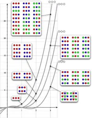 All proper vertex colorings of vertex graphs with 3 vertices using k colors for . The chromatic polynomial of each graph interpolates through the number of proper colorings.