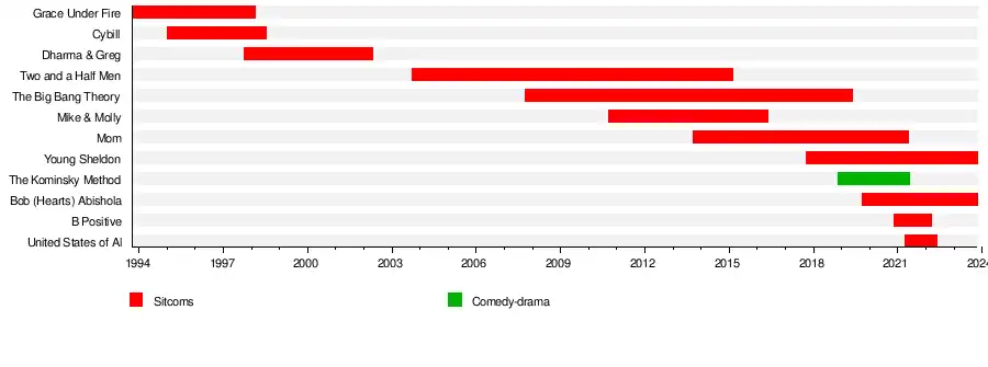 Called the "King of Sitcoms",[4][5][6][7] he has created/co-created and produced sitcoms including Grace Under Fire, Cybill, Dharma & Greg, Two and a Half Men, The Big Bang Theory, Mike & Molly, Mom, Young Sheldon, The Kominsky Method, Disjointed, Bob Hearts Abishola, B Positive, United States of Al, and How to Be a Bookie. He also served as an executive producer of Roseanne. He won Golden Globe Awards for Roseanne (1993) and Cybill (1996),[8] and won the 2019 Golden Globe Award for The Kominsky Method. In the 1990s, he founded Chuck Lorre Productions.