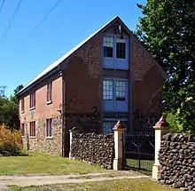 Chudleigh's town hall was completed in 1895, and opened during a public event on 11 April that year. It was funded by public subscription and built local builder Davis Brothers on donated land. It was built as a 46 by 26 feet (14.0 by 7.9 m) weather board building set on stone foundations, with a corrugated iron roof.[30] There was a near tragedy in the hall in late 1922 when a generator caught fire while the hall was being used by 300 people. The inwards opening doors and lack of a fire door were cited as significant problems.[31] Chudleigh had a post office from 1865.[32] Around 1899 it was moved to a new building[33] though it has since been closed and the building sold as a private home.[34] Chudleigh had a registered maternity hospital in the early 20th century.[24] For some time the town had an Australian rules football club. It closed in the 1930s, reformed in 1939,[35] then finally closed in the 1980s.[36] Telegraph communication followed construction of the railway line in the late 19th century. The first telephones were installed in Chudleigh homes in the 1930s, and mains electricity in the 1940s.[37]