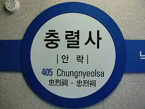 Chungnyeolsa Station (Korean: 충렬사역; Hanja: 忠烈祠驛) is an underground station of the Busan Metro Line 4 in Allak-dong, Dongnae District, Busan, South Korea.