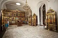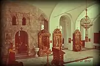 In the oldest area of the church, there is a "four-pillar cross-dome" with the facade formed by semicircular recesses built over cross-shaped columns.[7] The base of these columns are founded over marble columns which are provided with Corinthian capitals. It is inferred that this type of architectural feature existed on the basilicas built in the 6th century. Next to the western side of the church, there is a basilica which is dated between the 11th and 13th centuries.[7] A new chapel was added to the church in the 19th century, which was followed by enlarging the basilica with stone works, and with a belfry. The narthex, which existed in the old church, has been demolished. The building material used in the old part of the church is light Kerch limestone. The walls of the church have been built with bricks in successive layers, laid in alternate stages of four layers of masonry followed by four layers of red clay bricks which act against earthquake effects. However, in the new extensions made to the church this seismic proofed type of wall construction is not evident. The old part of the church has withstood the vagaries of weather conditions.[7] The interior of the church contains murals from the 13th–14th centuries.[10]