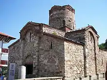 The Church of St. John the Baptist is a domed cruciform church, built of undressed stone. It is one of the best preserved churches in Nessebar. It is 12 meters long and 10 meters wide. The structure of the church consists of two cylindrical vaults which intersect in the center of the composition. The masonry is crushed stone and pebbles and the facades were probably smoothly plastered. It was built in the 11th century.[1] It has no narthex.[2] The altar space consists of three semi-circular apses. Four massive pillars support the dome and form the cross. Inside the church the walls are smooth and unbroken. The exterior is simple without decorative niches and ceramic plaques, typical of the ornamental style. Bricks were used as a decorative element over the entrance, in the jagged cornices and around the windows.