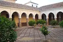 Prior to the current church, the site was occupied by the Great Mosque of the Albaicin (Arabic: مسجد الجامع البيازين, romanized: Masjid al-Jāmi' al-Bayyāzīn).[4] The mosque was built in the 13th century under Almohad rule.[5][4] Only its courtyard (sahn), with arcades of horseshoe arches, has been preserved today as part of the church. The mosque originally covered a total area measuring 42.4 by 32.2 metres.[6] Its prayer hall, now disappeared, had a hypostyle form similar to the city's larger Great Mosque on the site of the current Cathedral. It had 9 aisles divided by rows of arches supported by 86 marble columns, with the central aisle being wider than the others. The courtyard was planted with lemon trees. Across the street from the mosque, there originally stood an Islamic primary school and a khan (urban caravanserai).[6]