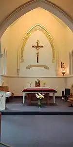 Born in Ireland, architect Edward Mahoney arrived in Auckland in February 1856 and designed the church using what has been called a "pared-back Gothic Revival style...[notable for]...well-lit interiors and the use of cross-braced roof trusses".[9] The church, initially a small timber building with a tower and spire, was opened on 12 May 1861 by Pompallier.[10] At that time another wooden building was constructed next to the church as a convent for the Sisters of Mercy who ran a school from the premises. The enlargement of the church in 1898 included a private chapel for the nuns. In 1903, the original convent was replaced by a larger structure with reception rooms, a refectory and quarters for nuns.[11]