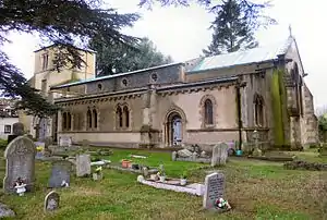In the South wall is a wide 19th-century Romanesque arch with interlinked chain motif, while on the North wall there is a large monument to Richard Ansell of 1726 and which is signed by R. Easton. There are funerary hatchments over the North and South doors and an octagonal 19th century arcaded stone pulpit matched by an octagonal stone baptismal font on eight coloured marble shafts, both added during the restoration by Scott. There is a monumental brass of Thomas Somer and his wife Marjory of about 1380 with an imperfect inscription. The church has a stained-glass window of 1898 by Charles Eamer Kempe.[2] In the north wall of the nave are two windows, one on each side of a blocked 12th-century Norman doorway which is damaged and has been repaired with cement, but which has a well-preserved chevron moulding on the rear-arch.[4]