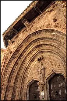 The church is located in the Plaza del Cementerio next to the Plaza mayor and the Torres de la Trinidad of city hall. Construction began in the 14th century, and it has a Gothic main portal. However the interiors were refurbished over the centuries. The chapel of Don Pedro Primero el Grande, is attributed to Andrés de Vandelvira and the Chapel of St Sebastian is attributed to his followers.[1]