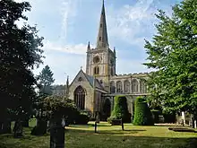 The past building dates from 1210 and is built on the site of a Saxon monastery. It is Stratford's oldest building, is situated on the banks of the River Avon, and is one of England's most visited churches.[5] In the fourteenth century, John de Stratford founded a chantry, which was rebuilt between 1465 and 1497 by Dean Thomas Balshall, who is buried at the church.[6][7] The building is believed to have originally had a wooden spire, which was replaced by William Hiorne in 1763.[6]