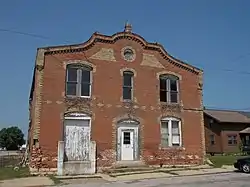 The town of Wheatland was established in 1858 by New York native John L. Bennett to take advantage of the Chicago & North Western Railway (C&NW) that was being built through southern Clinton County at the same time. This was the second hotel built on this site near the C&NW depot. It was designed by Antheona Araah, an Italian-born artist/photographer who also was involved in designing and constructing buildings.[2] He was based out of Oxford Junction, Iowa in southeastern Jones County. The previous hotel was opened in 1889 in an existing building was re-purposed as a hotel. It was destroyed in a fire on February 7, 1893 that also took several other wooden structures nearby. Work on this building began immediately and it opened for business in September of the same year. The Lincoln Highway passed through Wheatland to the north of the railroad tracks in 1915, and the City Hotel was not along its route. As automobiles began to replace train travel the City Hotel's business began to decline. It closed in the late 1920s or early 1930s. After sitting empty for a few years, the Seifert family opened a tavern on the main floor in 1937, and lived in a part of the upstairs. Emil Koch, who owned the tavern across the street, bought the building two years later. It sat empty from 1939 to 1951. The interior of the building was remodeled in 1951 and used as a feed mill until September 1980. From 1980 to 1995 it was used as a warehouse.