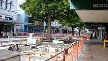 A separate project that affected the City Mall redevelopment was the extension of the heritage tramway. From the previous circuit on Worcester Street, the extension would see the trams turn left into Oxford Terrace (The Strip), and then left into the Cashel Street part of City Mall. At the intersection with High Street, trams would turn south-east towards Lichfield Street. On the return journey, trams would travel north-west along High Street, including the City Mall part of it. The $10.8 million project, to be funded from grants and from borrowing, was due to be completed in the 2013/14 financial year.[21]