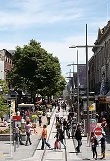 City Mall is the main pedestrian mall in the central city of Christchurch, New Zealand, comprising two sections of Cashel Street plus the Bridge of Remembrance and one section of High Street. It is also known colloquially as Cashel Mall.[1][2][3][4] The Bridge of Remembrance was pedestrianised in 1976. The main mall was closed to traffic on 11 January 1982 and formally reopened as a pedestrian mall on 7 August, but it was not until 1992 that the entire mall was paved. The mall was redeveloped between 2006 and 2009, and track was installed for an expansion of the heritage tram network.