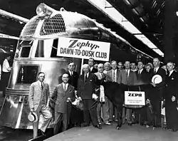 In the mid-1920s Denver financed the Moffat Tunnel through the Rocky Mountains which, when it opened in 1928, shortened the distance between Denver and the Pacific coast by 176 miles (283 km). The tunnel opened just as rail travel was undergoing a transformation in the 1930s. The Burlington Railroad introduced the Zephyr in 1934 with a record-breaking 13 hours and 5 minutes trip from Denver to Chicago. It was a revolutionary new diesel-powered train, streamlined and luxurious, that changed the public's expectations of rail travel.[47] Having a direct link to the west coast helped Denver compete against Cheyenne and Pueblo for rail business and it quickly became a major hub for railways.[51] Denver was struck on August 3, 1933, with a major flood of Cherry Creek following the failure of the Castlewood Dam.[52][53][54]