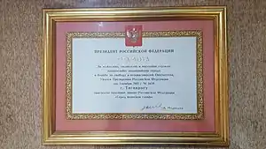 36. "Russian President Dmitry Medvedev presented the certificate conferring the title of City of Military Glory title to the Mayor of Taganrog". taganrogcity.com. February 24, 2012. Retrieved February 24, 2012.