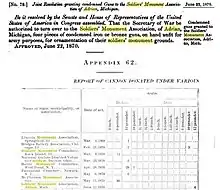 Architect and sculptor Benjamin H. Latrobe created the design of the column for the Pennsylvania Bank. The monument architect was Francis R. Stebbins of Adrian Michigan. The column was donated to the association by a joint act of Congress, (No-78) dated July 27, 1868. The sandstone base and urn at the top came to a cost of $10,000 raised by the monument association. The monument was unveiled in Monument Park on July 4, 1870 by the Adrian Soldiers’ Monument Association. It was the second such commemorative monument erected in Lenawee County following the war — the first being a cemetery monument erected in nearby Franklin Township.[4]