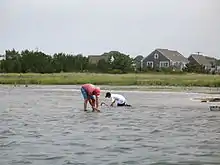 Clam digging is a North American term for a common way to harvest clams (edible infaunal bivalve mollusks) from below the surface of the tidal sand flats or mud flats where they live. It is done both recreationally (for enjoyment or as a source of food) and commercially (as a source of income). Commercial digging in the U.S. and Canada is colloquially referred to as clamming, and is done by a clammer.[1]